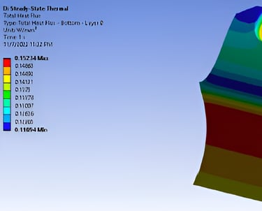 A scaled bullet and vest geometry were modeled in SOLIDWORKS and assembled as layered composites. Composite stack-ups were defined in ANSYS ACP (Pre) using woven fiber models. Explicit dynamic simulations were performed with a tungsten bullet (0.61 g) impacting the vest at 426–480 m/s to evaluate deformation and kinetic energy absorption. Steady-state thermal analyses were conducted to compute heat flux and temperature gradients across layers. Four material combinations using Kevlar, Graphene, Boron Carbide, Silicon Carbide, and Spectra were simulated and compared.