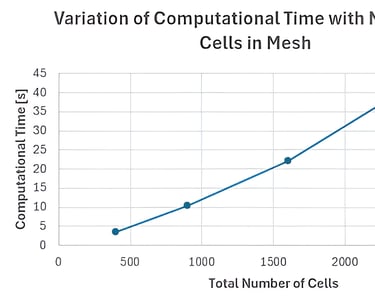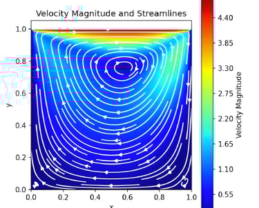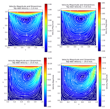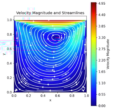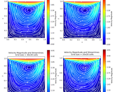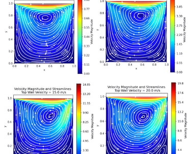 The governing vorticity transport and Poisson stream-function equations were discretized using finite differences and implemented in Python. A Successive Over-Relaxation (SOR) scheme was used to solve the stream-function equation at each time step. Boundary conditions for vorticity and stream function were analytically derived and explicitly enforced at all walls, with special treatment of the moving lid. Velocity components were computed from the stream function using central differencing. Parametric studies were performed by varying top-wall velocity and mesh resolution, with convergence and CFL stability monitored.