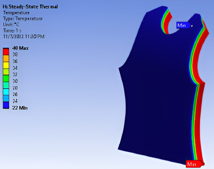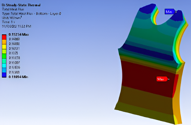 A scaled bullet and vest geometry were modeled in SOLIDWORKS and assembled as layered composites. Composite stack-ups were defined in ANSYS ACP (Pre) using woven fiber models. Explicit dynamic simulations were performed with a tungsten bullet (0.61 g) impacting the vest at 426–480 m/s to evaluate deformation and kinetic energy absorption. Steady-state thermal analyses were conducted to compute heat flux and temperature gradients across layers. Four material combinations using Kevlar, Graphene, Boron Carbide, Silicon Carbide, and Spectra were simulated and compared.