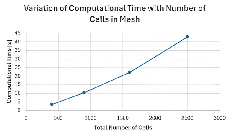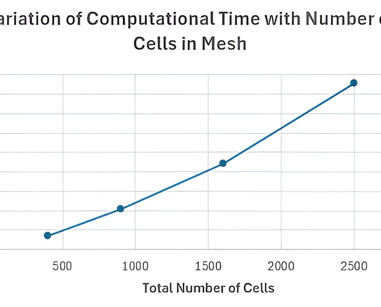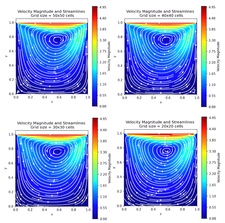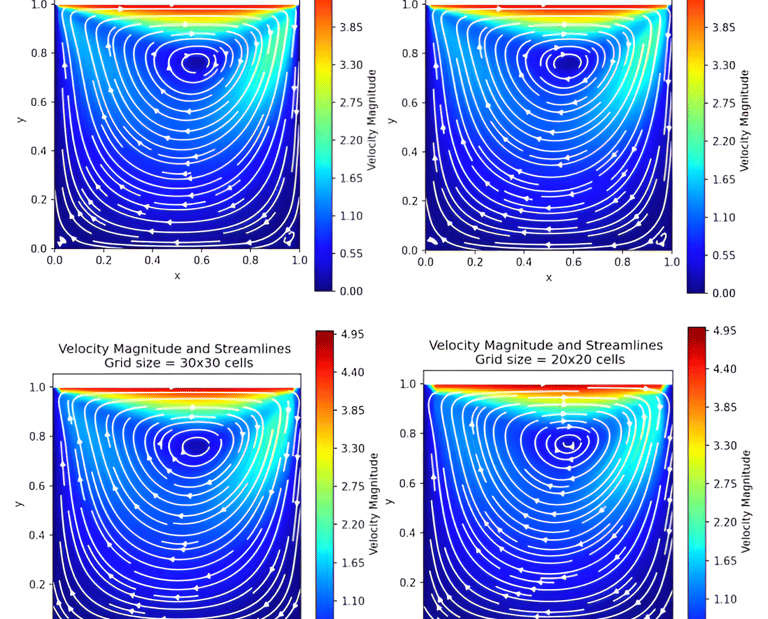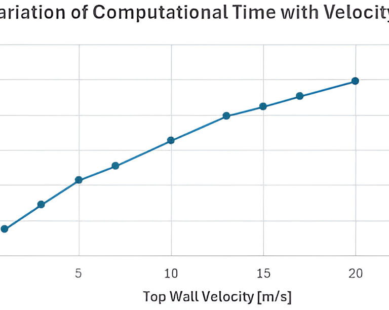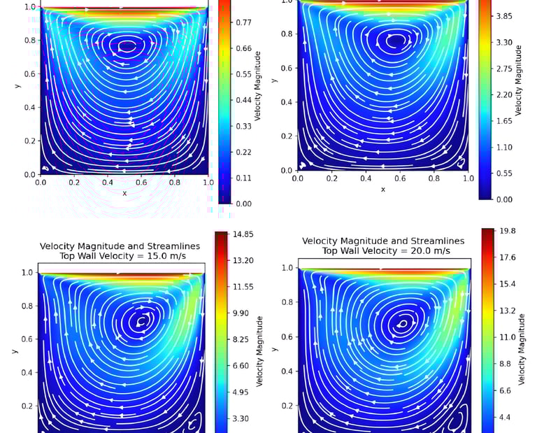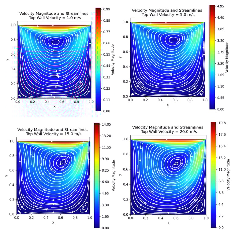 The governing vorticity transport and Poisson stream-function equations were discretized using finite differences and implemented in Python. A Successive Over-Relaxation (SOR) scheme was used to solve the stream-function equation at each time step. Boundary conditions for vorticity and stream function were analytically derived and explicitly enforced at all walls, with special treatment of the moving lid. Velocity components were computed from the stream function using central differencing. Parametric studies were performed by varying top-wall velocity and mesh resolution, with convergence and CFL stability monitored.