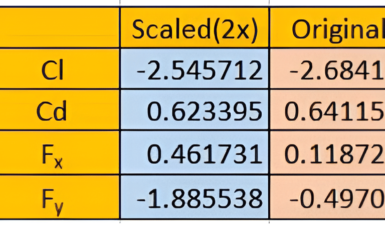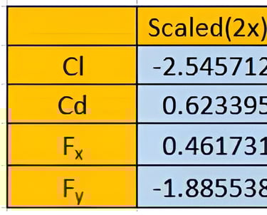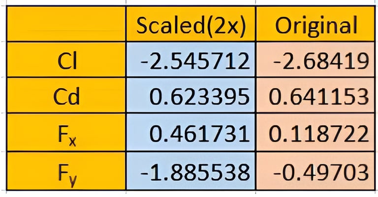 Scaling the airfoil geometry by 2× increased Cl by 5.16% and reduced Cd by 2.77%